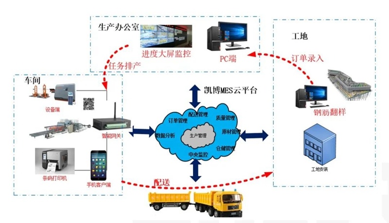 并且,凱博科技攜手中國鐵道科學(xué)研究院集團(tuán)有限公司,開發(fā)凱博鋼筋加工管理軟件系統(tǒng)和鋼筋加工遠(yuǎn)程控制系統(tǒng),打造智能控制中心。鋼筋加工管理軟件系統(tǒng)以鋼筋加工過程中物資流管理為核心,借助工業(yè)互聯(lián)網(wǎng)、云服務(wù)、智能設(shè)備等技術(shù)手段,實(shí)現(xiàn)多項(xiàng)目多任務(wù)遠(yuǎn)程訂單管理,實(shí)現(xiàn)訂單排產(chǎn)、生產(chǎn)訂單分發(fā)、生產(chǎn)標(biāo)牌打印、成品完成報工,成品出入庫等功能,同時能夠以電子大屏實(shí)現(xiàn)項(xiàng)目訂單動態(tài)實(shí)時監(jiān)控、加工廠整體運(yùn)營狀態(tài)的中心化顯示。鋼筋加工遠(yuǎn)程控制系統(tǒng),可實(shí)時顯示加工場各種設(shè)備生產(chǎn)狀態(tài),同時實(shí)現(xiàn)中控室對現(xiàn)場設(shè)備啟動和停止的遠(yuǎn)程控制,造就了高鐵梁場鋼筋加工數(shù)字化新模式!