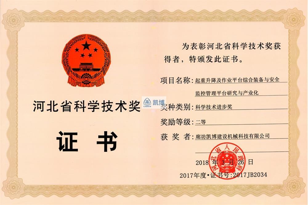 河北省科學技術獎二等獎 起重升降及作業平臺綜合裝備與安全監控管理平臺研究與產業化