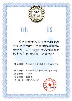 華夏建設科學技術獎 住宅排氣道成型技術及設備的研發