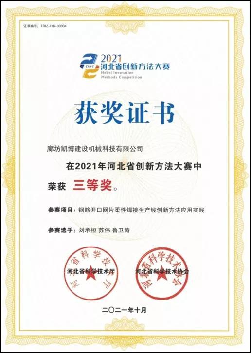 廊坊凱博建設機械科技有限公司完成的“鋼筋開口網片柔性焊接生產線創新方法應用實踐”項目在2021年河北省創新方法大賽中榮獲三等獎。