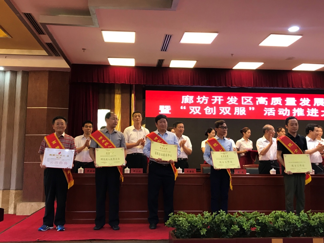 8月1日下午,廊坊開發區召開高質量發展暨“雙創雙服”活動推進大會。我公司獲得“優秀貢獻獎”和“高新技術企業”兩項獎勵,共獲得獎勵資金40萬元。在獲得貢獻獎的60家企業中我公司排名第34位;我公司董事長兼總經理李守林作為“科技創新前十佳”上臺領獎。