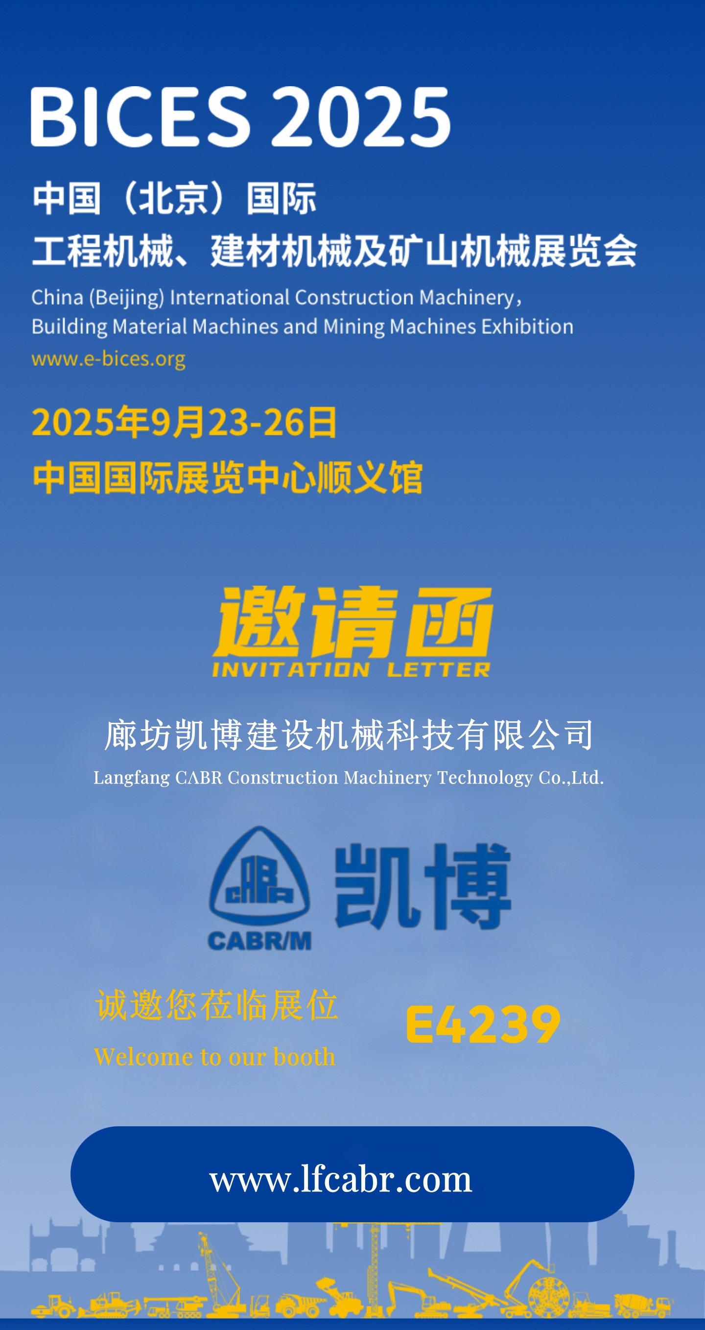 中國(北京)國際工程機械、建材機械及礦山機械展覽會(BICES 2025)將于2025年9月23-26日在中國國際展覽中心順義館舉辦。廊坊凱博建設機械科技有限公司邀您相約北京!